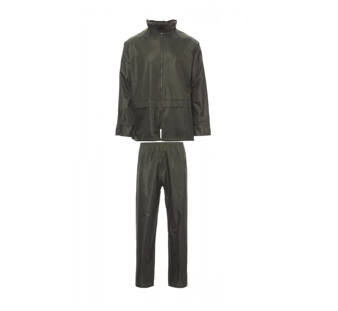 Il completo antipioggia, con spalmatura in PVC, garantisce impermeabilità e resistenza. La giacca è dotata di zip, cappuccio richiudibile nel colletto e fondo manica dritto, mentre la retinatura sulla schiena aumenta la traspirabilità. Il pantalone, con elastico in vita e due tasche, assicura comfort e praticità. L'imbusto singolo con zip rende il completo facile da indossare e comodo. Realizzato in poliestere spalmato, è leggero (180 g/mq) e ideale per affrontare la pioggia. Inoltre, il prodotto può essere personalizzato con loghi. Aspetti tecnici: