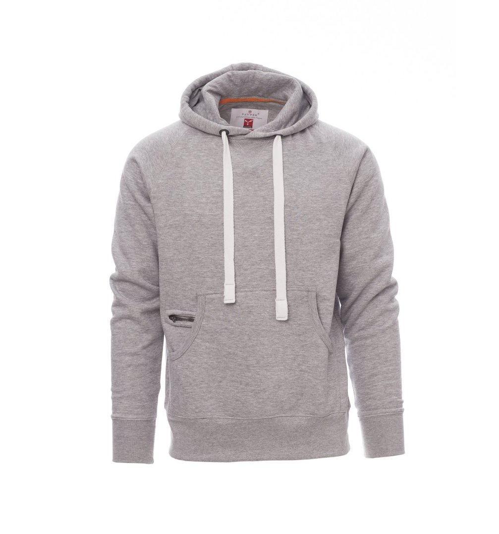 Felpa da uomo dallo stile sportivo ma curato nei dettagli, ideale per chi cerca comfort, resistenza e un look moderno. Realizzata con una miscela di cotone e poliestere garzato da 300 g/m², offre calore e morbidezza, mantenendo la forma anche dopo numerosi lavaggi. Il cappuccio doppia cucitura con coulisse in corda e finiture in metallo, unito alle cuciture rinforzate e alla manica raglan, garantisce massima durata e libertà di movimento. Completano il design le tasche a marsupio con taschino zip e dettagli estetici come la cucitura a V sul collo. Aspetti tecnici